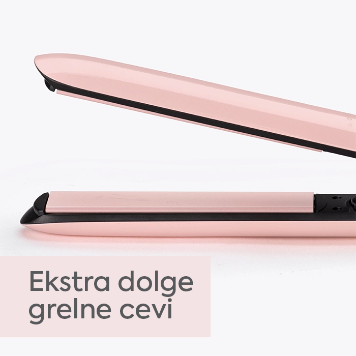 Napredna keramična prevleka zagotavlja izjemno hitre rezultate, zahvaljujoč hitremu segrevanju plošč z enakomerno temperaturo. Dolge plošče lahko zravnajo večje pramene las z enim samim potegom!